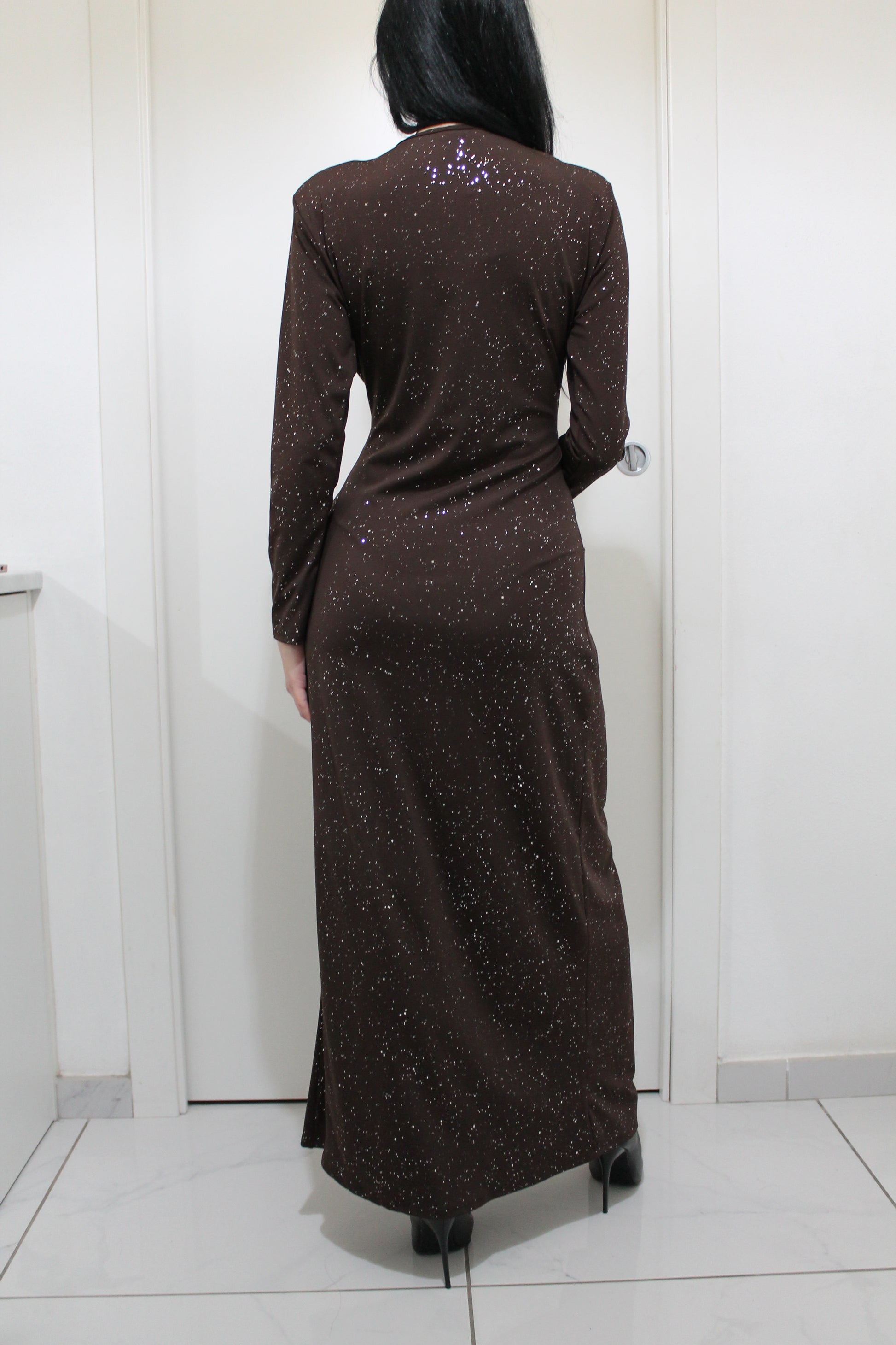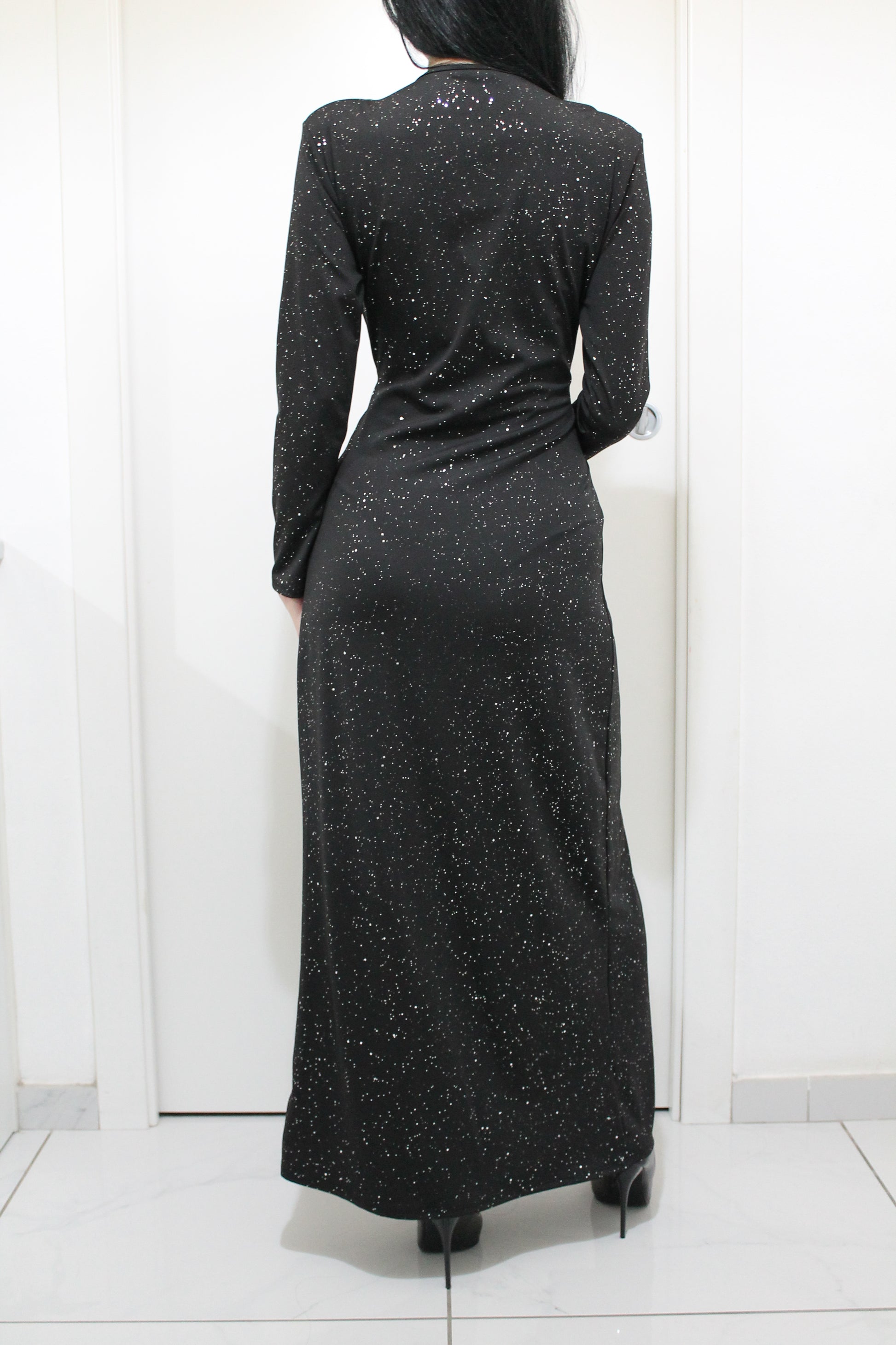 Abito lungo con glitter, drappeggio frontale e spacco laterale.