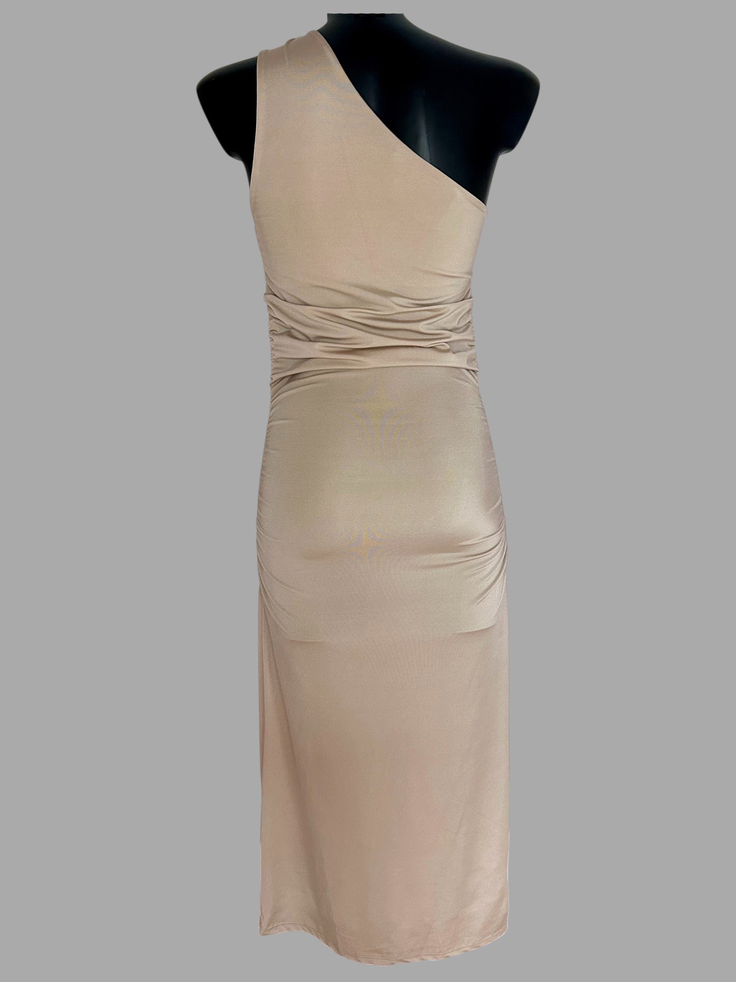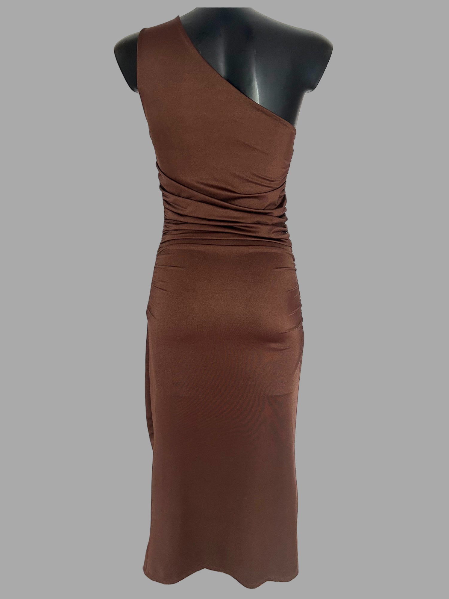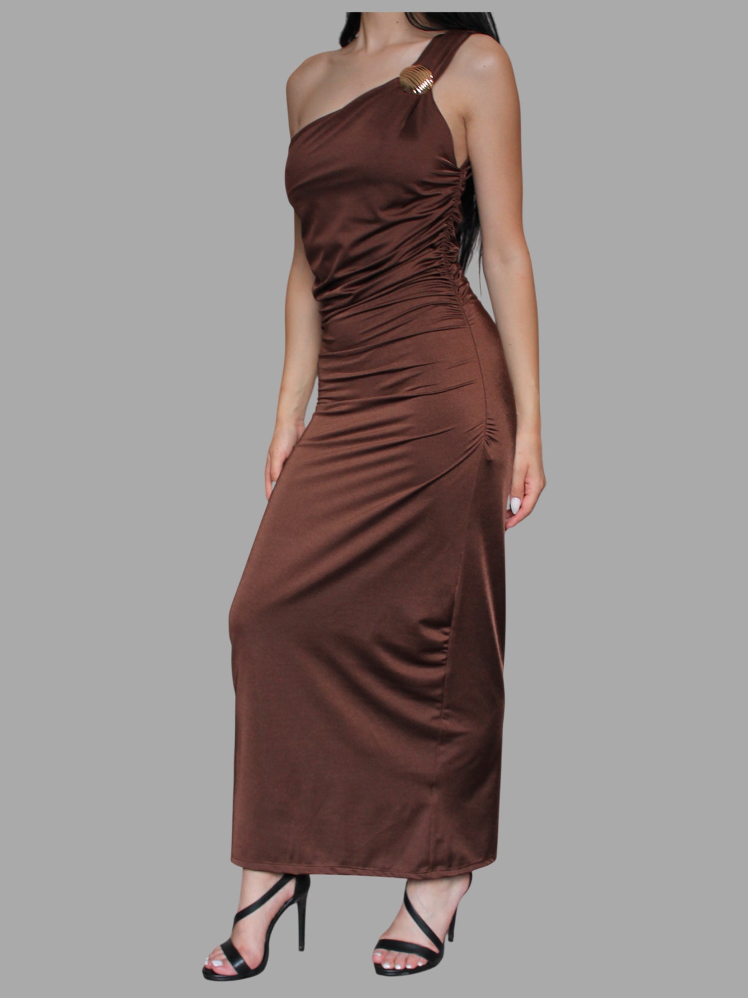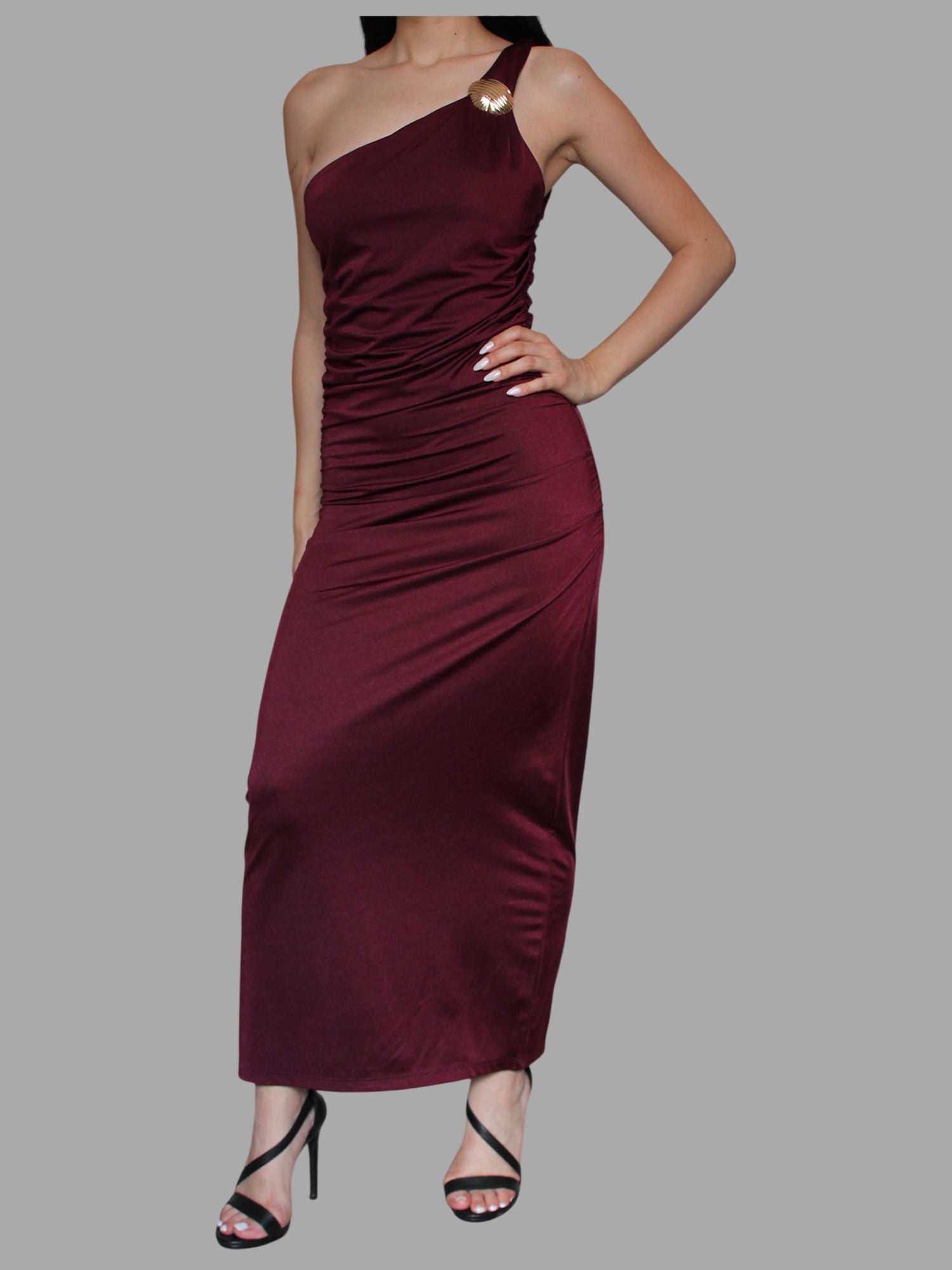 Abito lungo monospalla, valorizzare la figura con raffinatezza. Design asimmetrico con spallina singola con l'aggiunta del dettaglio in gioiello.