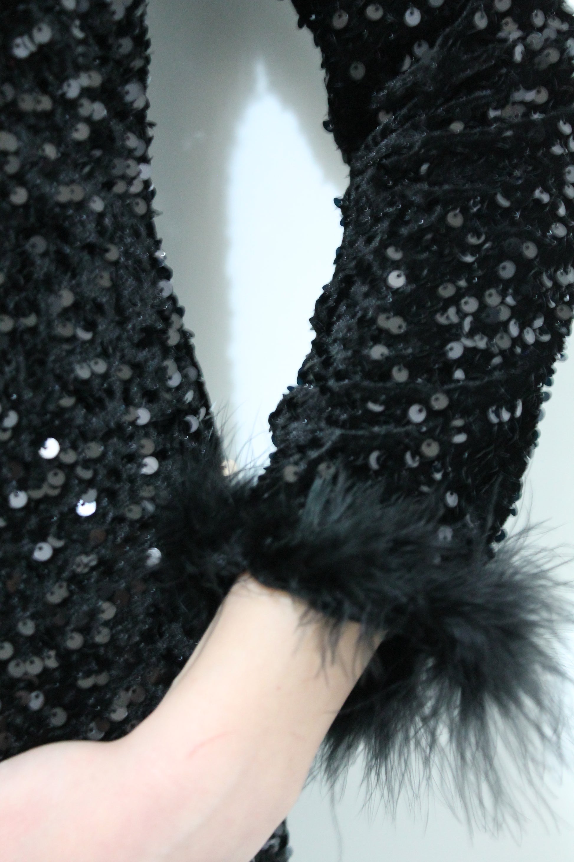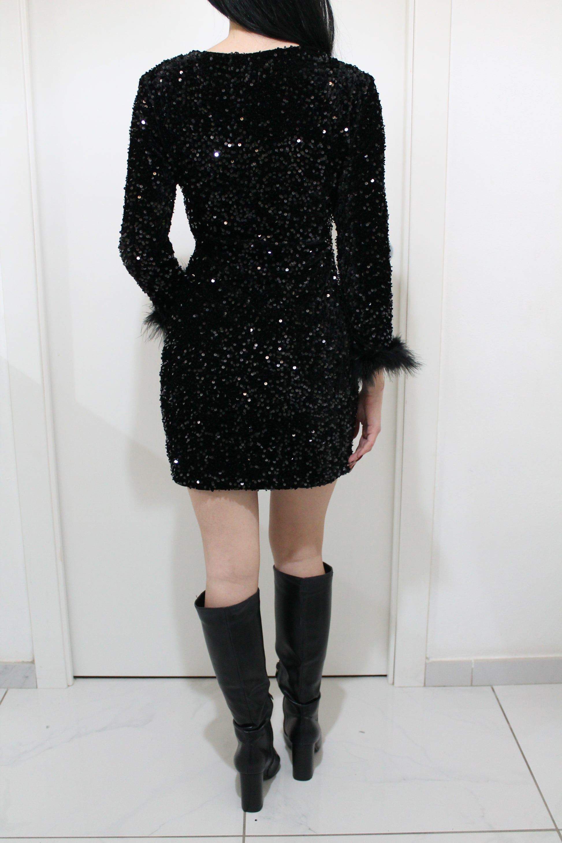 Abito Nero in Paillettes con Piume – Maniche Lunghe