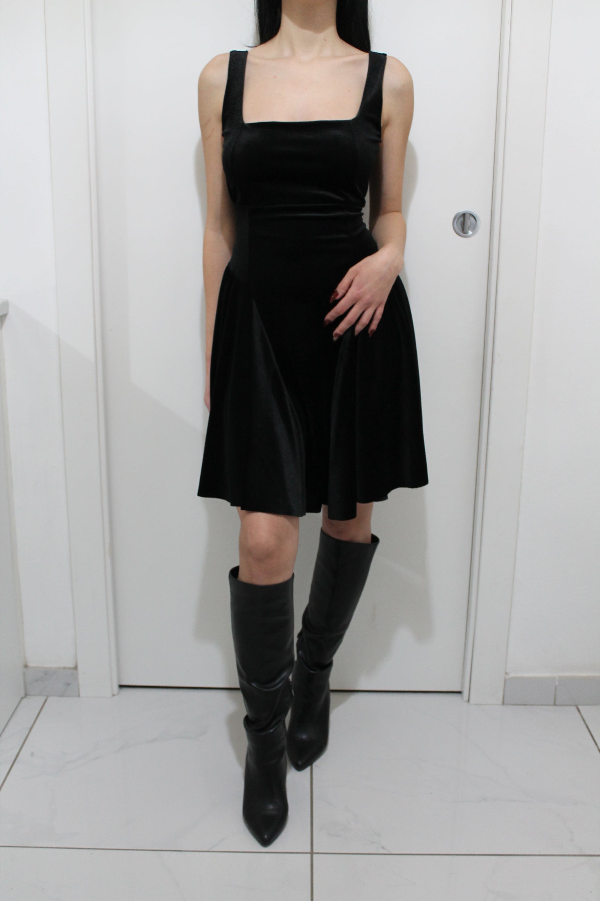 Elegante e sensuale, questo abito in velluto nero presenta una scollatura quadrata frontale e una splendida schiena scoperta con fiocco regolabile. La gonna morbida dona movimento e femminilità.