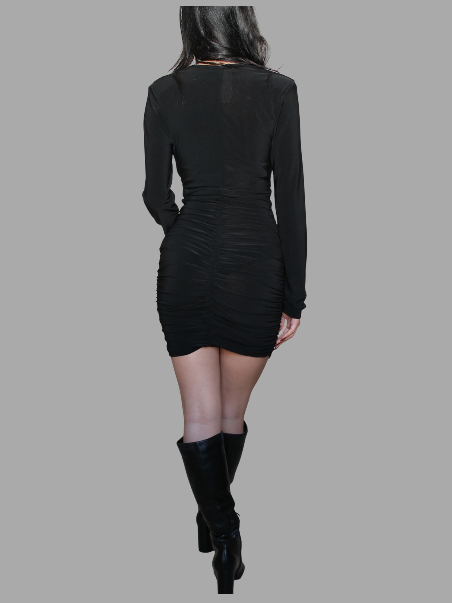 Abito elegante con drappeggi sui fianchi e scollo morbido.