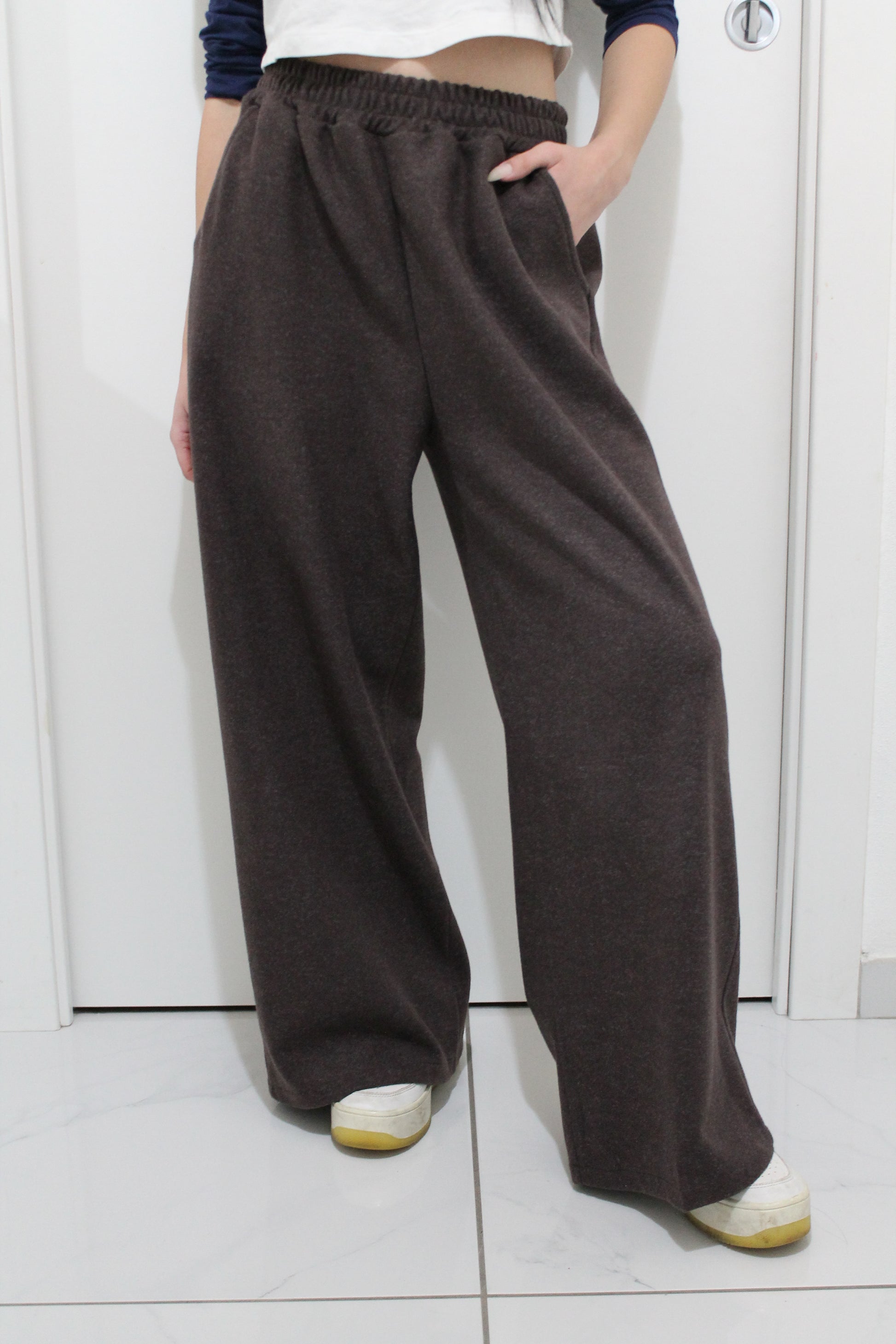 Pantalone morbido e avvolgente in tessuto effetto lanoso, caldo e confortevole. Modello a palazzo con vita elasticizzata.