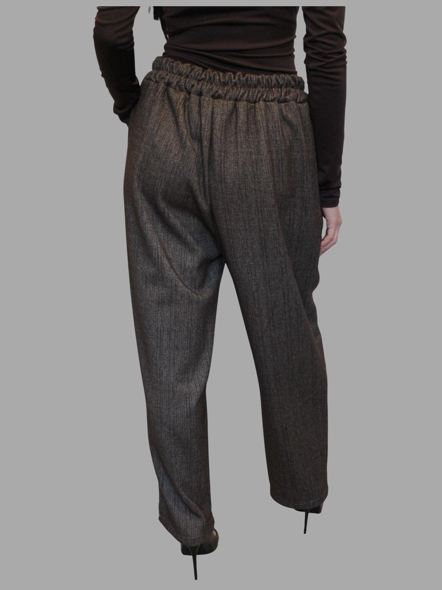 Pantalone in tessuto pesante e morbido, con comodo elastico in vita. Perfetto per look eleganti o casual, dona comfort e stile in ogni occasione.