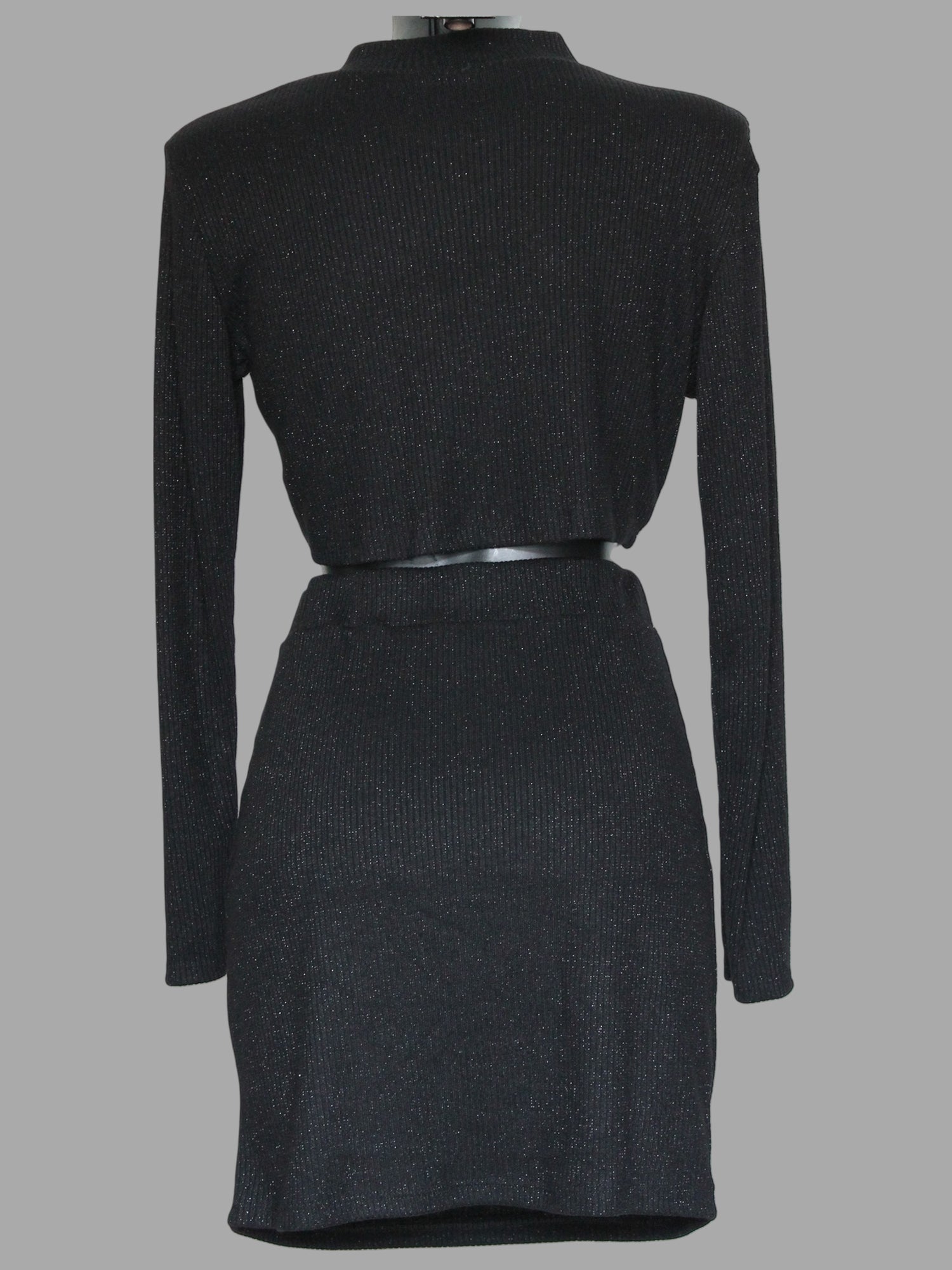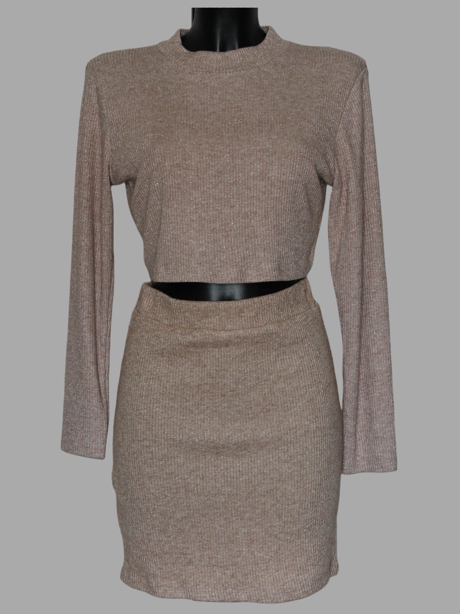 Set coordinato in lurex scintillante è perfetto per chi desidera un look audace e sofisticato. Composto da un crop top a maniche lunghe e una mini gonna, il tessuto luminoso cattura la luce ad ogni movimento.